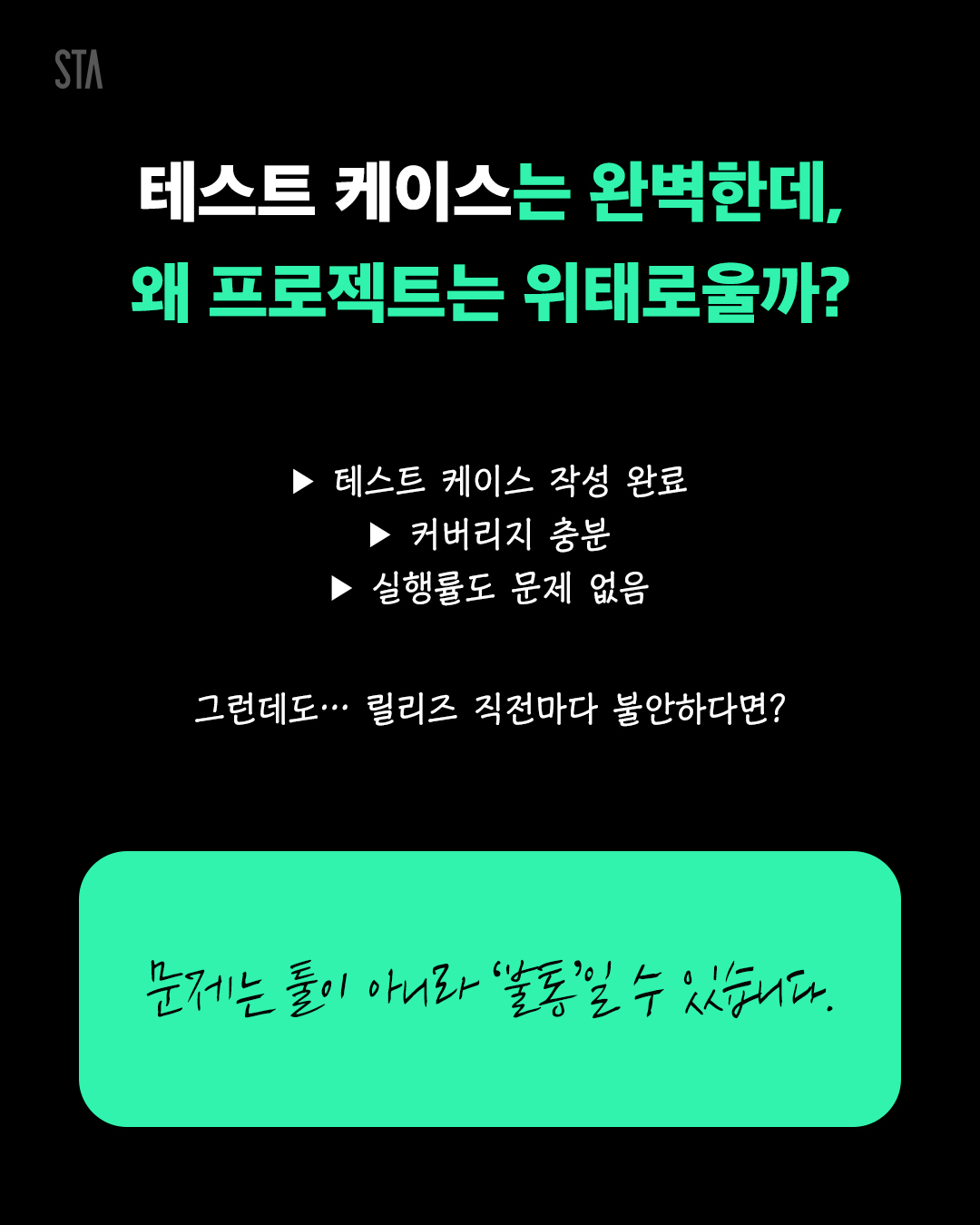 “테스트 케이스는 다 작성했고, 커버리지도 충분합니다.” 그런데도 프로젝트는 늘 어딘가 불안합니다.